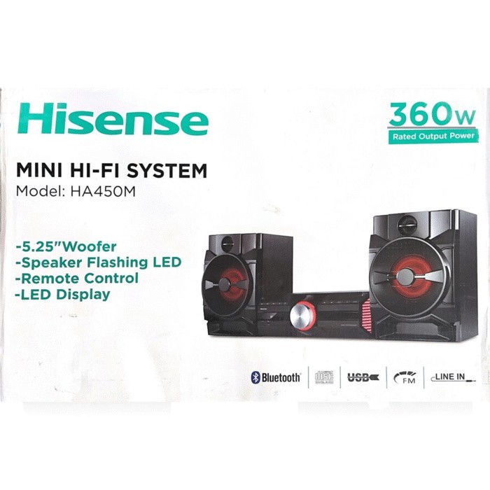 Hisense HA450 Mini HiFi System- 2.0 Channel Stereo Speakers, Total Power Output 360W (2x180w), USB Playback, Analogue FM Radio, Bluetooth Connectivity, 3.5mm AUX Input, LED Display Screen, Remote Control.